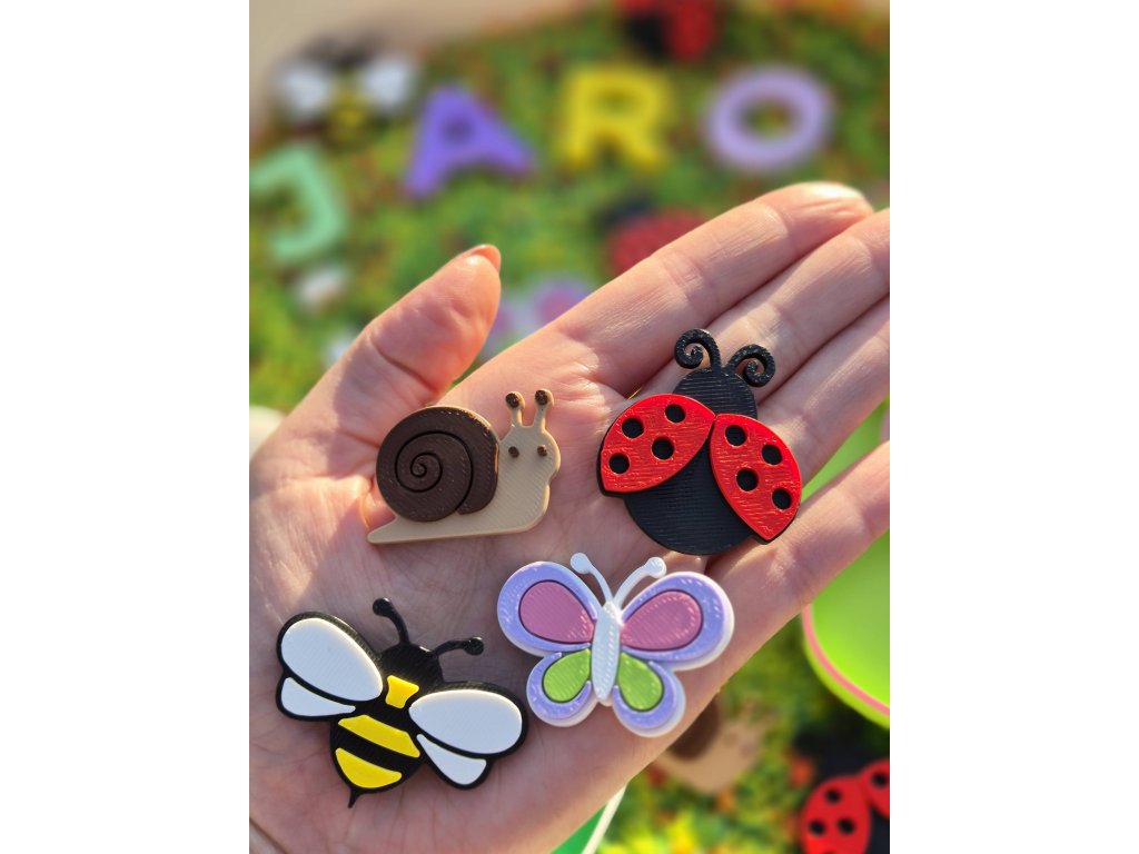 V sadě děti najdou včelku, berušku, motýla a šneka, se kterými mohou vytvářet vlastní jarní scénky, třídit podle barev nebo je zapojit do senzorických misek a herních světů. Hra přirozeně podporuje fantazii, jemnou motoriku i zájem o přírodu.