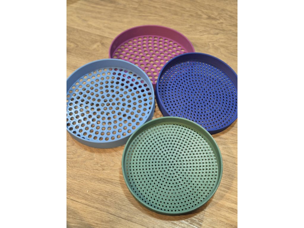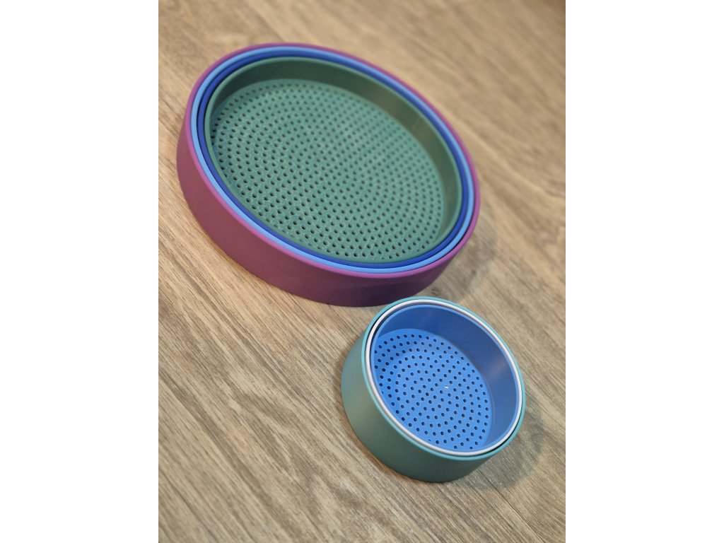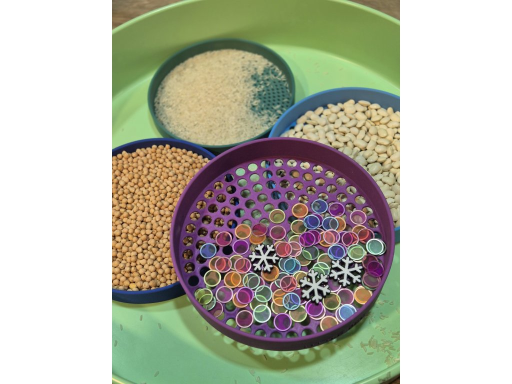 Naše 3D tištěná sítka pro smyslové hraní umožňují dětem pozorovat rozdíly v tvarech, velikostech a texturách materiálů. Každé sítko má jinou velikost otvorů, takže jimi propadávají jen určité části — ideální pro smyslové boxy, písek, rýži nebo korálky.