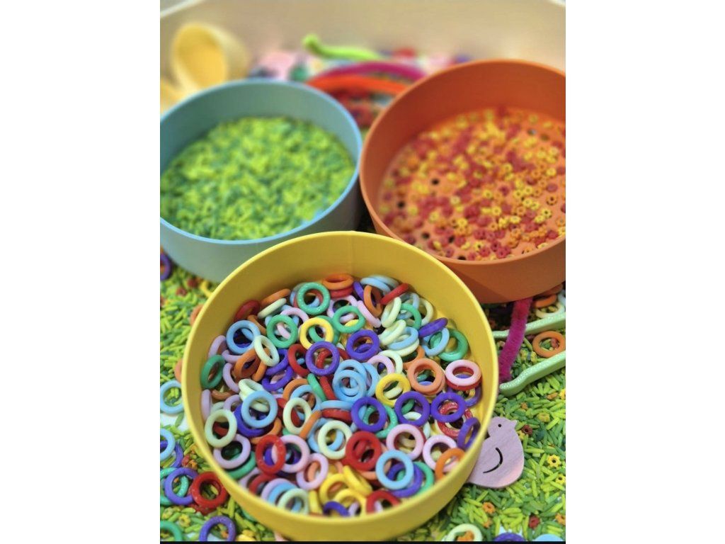 – třídění různých materiálů (rýže, hrách, korálky, kamínky, těstoviny aj.)