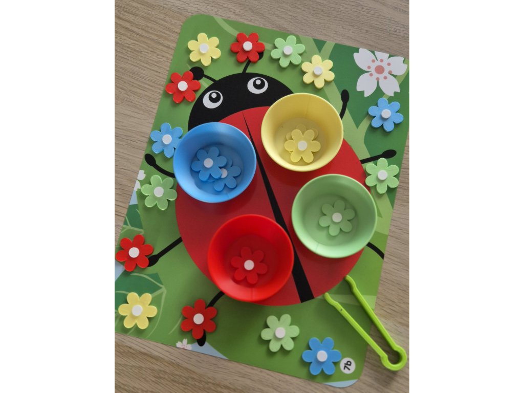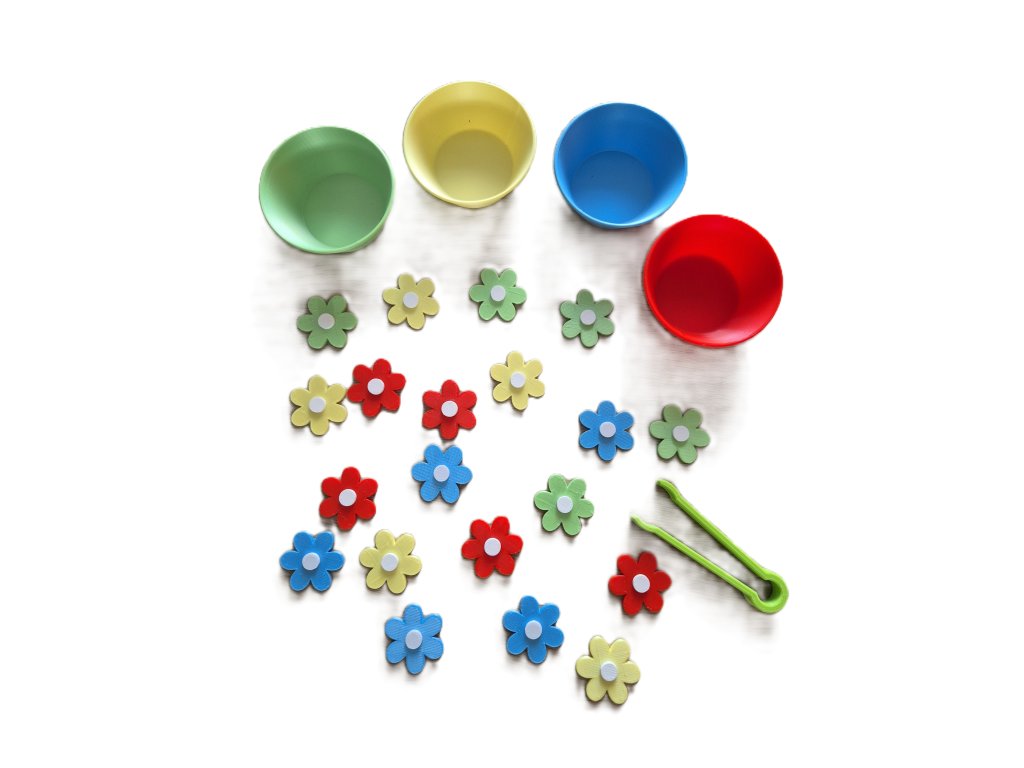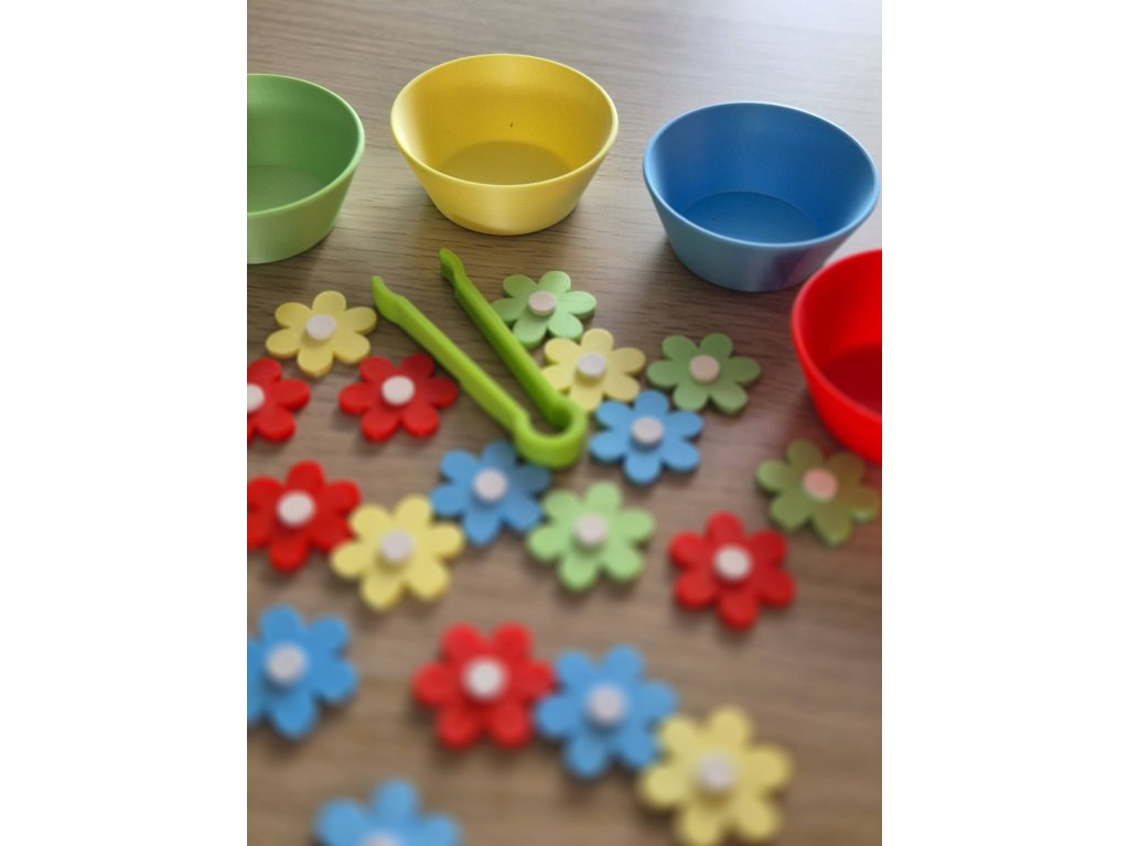 Zábavná a hravá pomůcka pro děti, která podporuje třídění barev, jemnou motoriku a soustředění. Sada obsahuje barevné květiny, mističky a pinzetu, díky kterým si děti mohou procvičovat třídění podle barev a zároveň trénovat úchop.