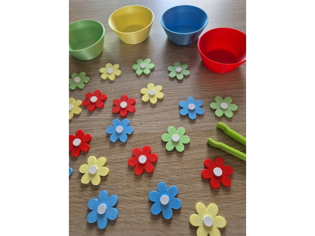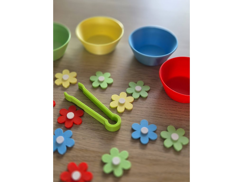 Děti mohou květiny třídit do správných misek, přenášet je pinzetou nebo počítat, kolik jich do každé misky patří. Hra tak přirozeně rozvíjí logické myšlení, koordinaci ruky a oka i samostatnost.